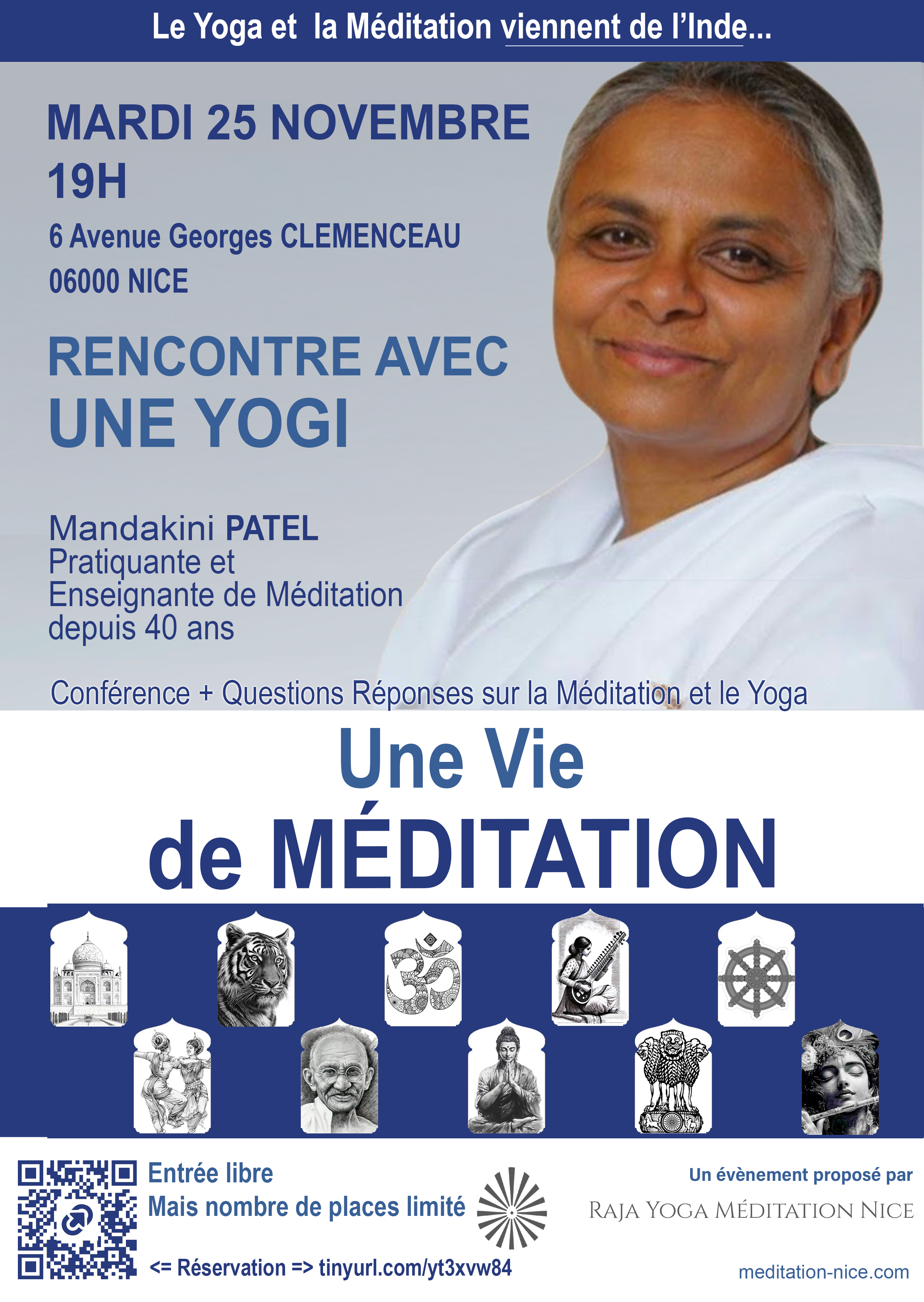 Ce sera également l’occasion de lui poser vos questions, d’échanger librement et de nourrir votre propre pratique.La venue à Nice de Manda Patel, yogi indienne qui pratique et enseigne la méditation depuis plus de 40 ans, et dirige aujourd’hui un centre de retraite et de pratique du Raja Yoga près d’Oxford. Recevoir une telle intervenante est une opportunité rare, qui ne se présente qu’une à deux fois par an. Et, tout comme on savoure un plat traditionnel préparé par quelqu’un issu de la culture qui l’a fait naître, rencontrer une yogi venue d’Inde apporte une profondeur et une authenticité particulières — quelque chose qu’on ressent immédiatement. Autre atout précieux : bien qu’elle soit née et formée en Inde, Mandakini Patel vit depuis longtemps en Occident. Elle fait donc véritablement le pont entre deux cultures. Cela lui permet d’expliquer les concepts spirituels indiens avec une clarté accessible à tous, d’adapter son enseignement aux réalités de notre vie moderne, et d’enrichir la tradition par une approche pédagogique ancrée dans l’expérience des deux mondes. Ce sera également l’occasion de lui poser vos questions, d’échanger librement et de nourrir votre propre pratique.